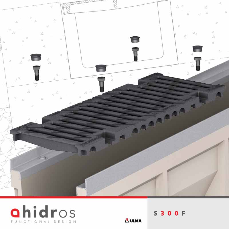 Sistema de Canalización para Drenaje Pluvial Lineal ULMA modelo S300F, fabricado en concreto polimérico, con perfil de Ac. Galvanizado integrado al canal, sin pendiente.